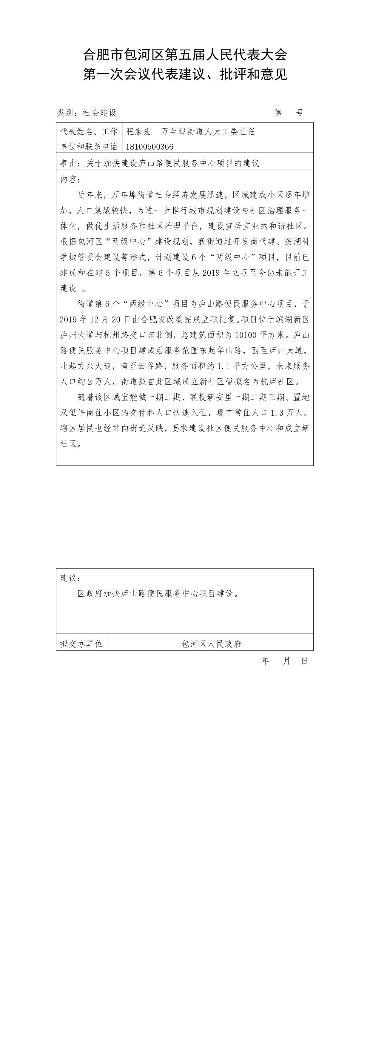 程家宏代表关于加快庐山路便民服务中心项目建设的建议