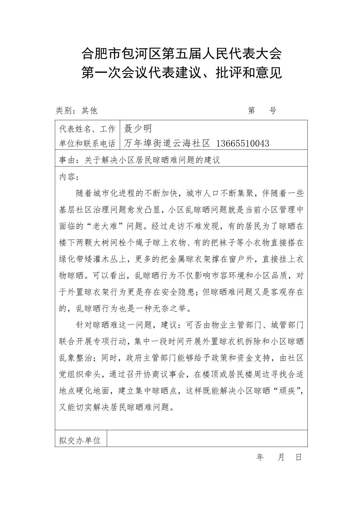 聂少明代表关于解决小区居民晾晒难问题的建议