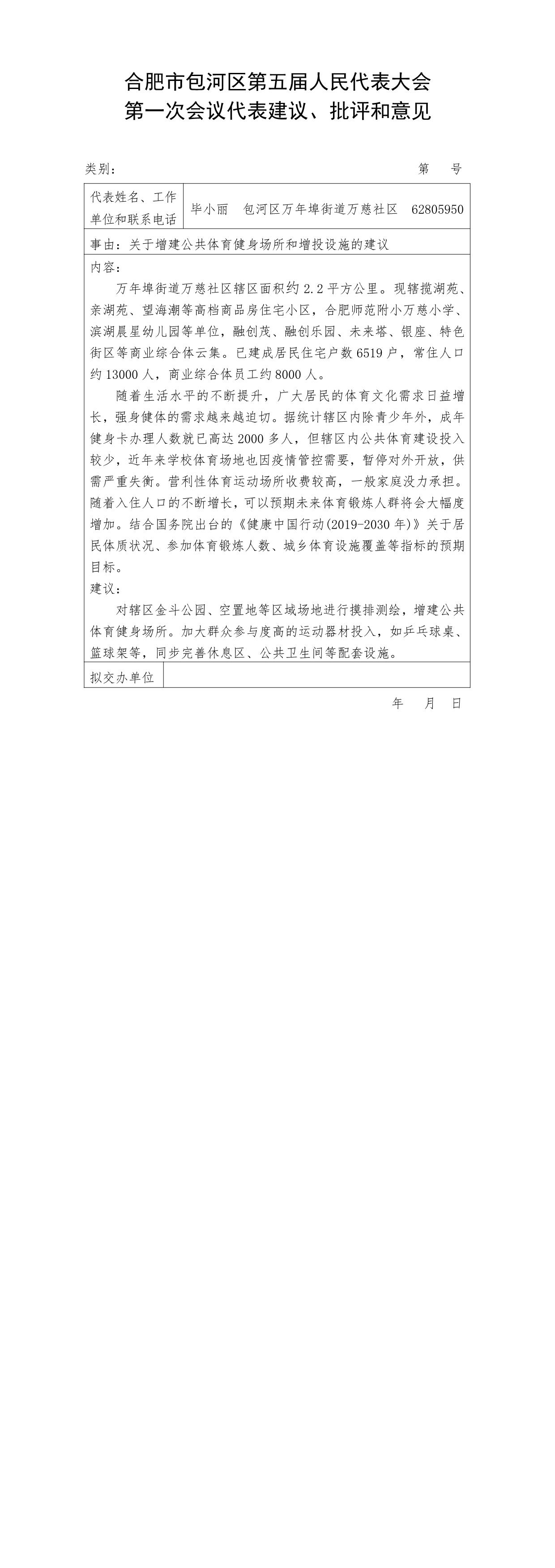 毕小丽代表关于增建公共体育健身场所和增投设施的建议