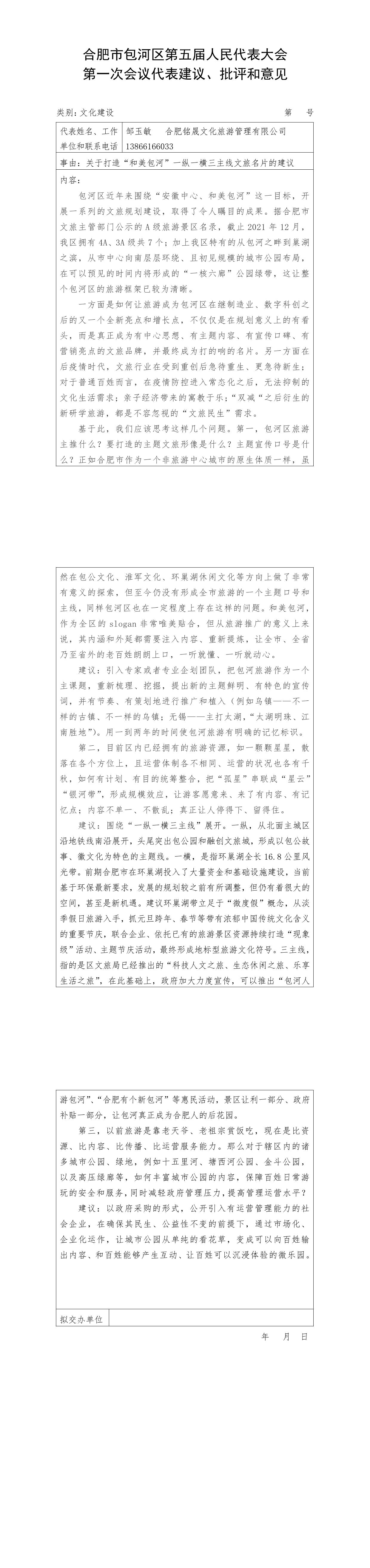 邹玉敏代表关于打造“和美包河”一纵一横三主线文旅名片的建议