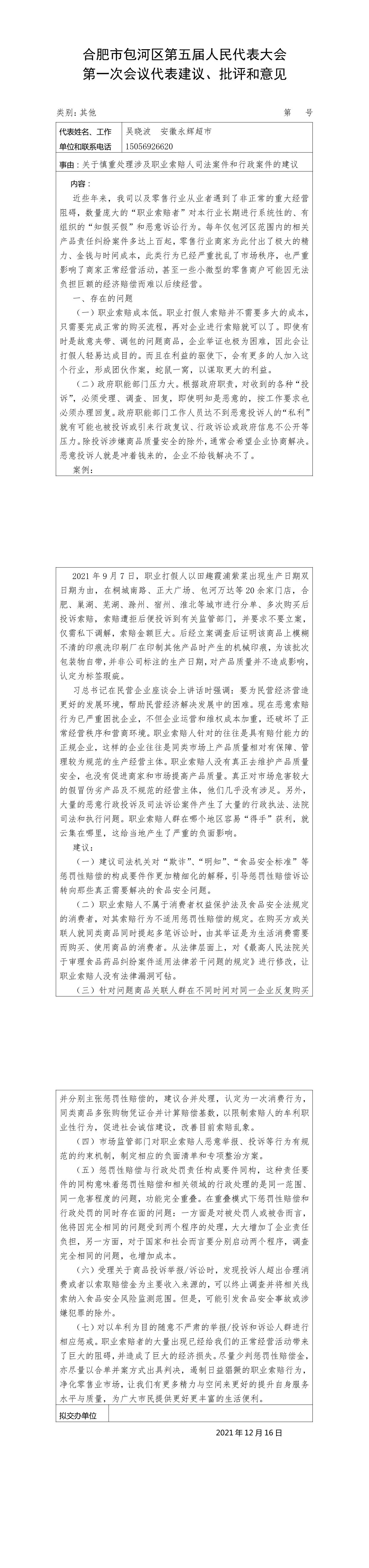 吴晓波代表关于慎重处理涉及职业索赔人司法案件和行政案件的建议