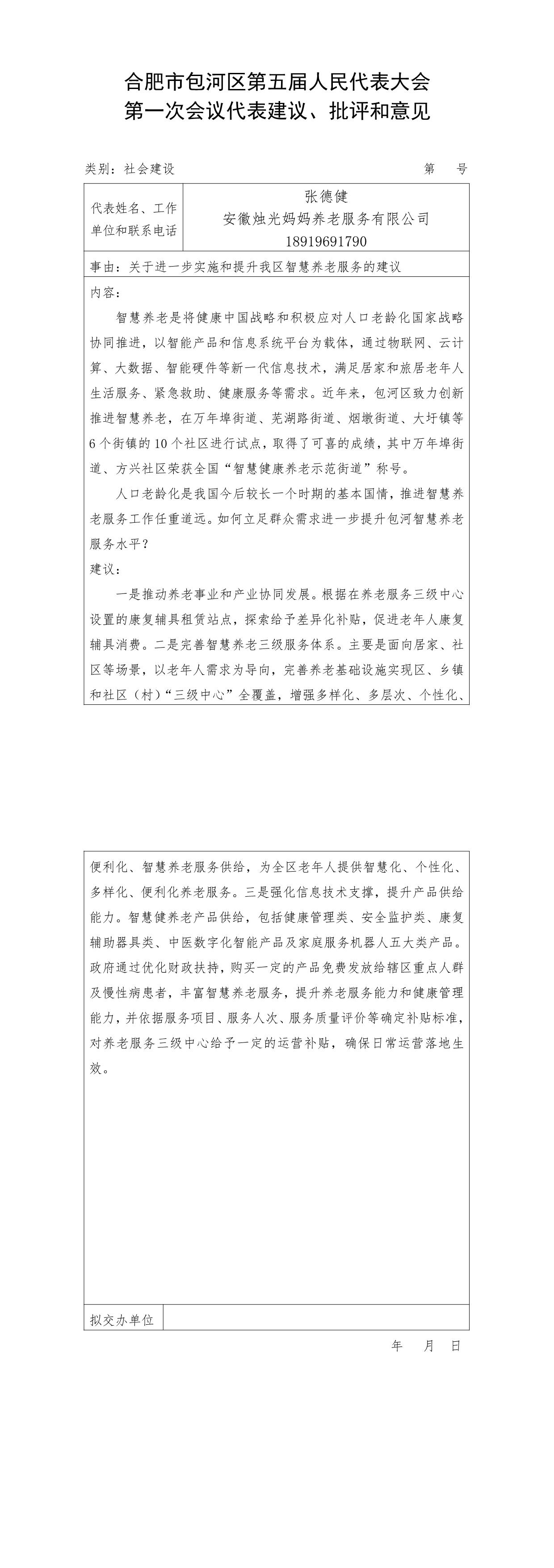 张德健代表关于进一步实施和提升我区智慧养老服务的建议