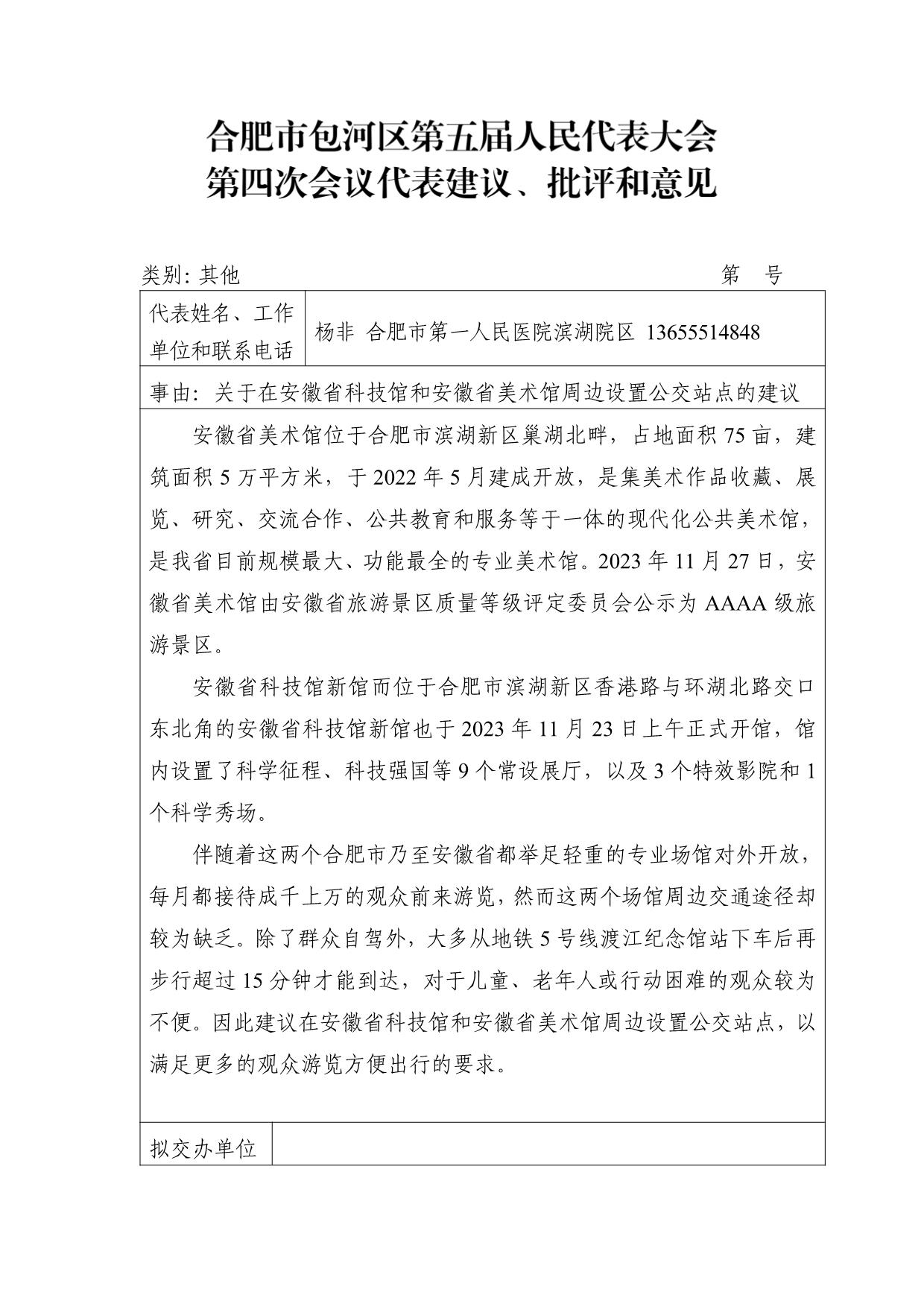 关于在安徽省科技馆和安徽省美术馆周边设置公交站点的建议-杨非