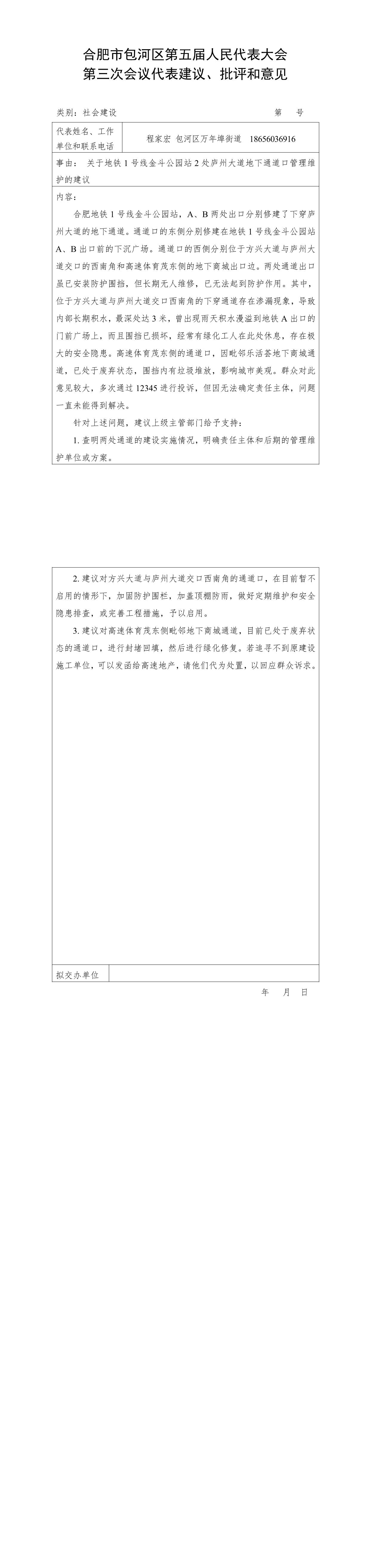 关于地铁1号线金斗公园站2处庐州大道地下通道口管理维护的建议