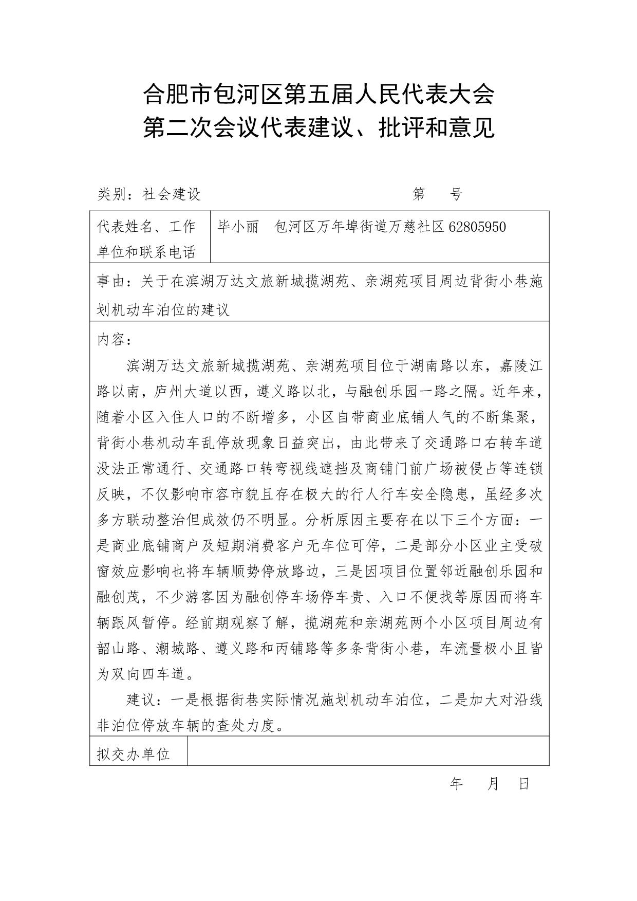 毕小丽代表关于在滨湖万达文旅新城揽湖苑、亲湖苑项目周边背街小巷施划机动车泊位的建议